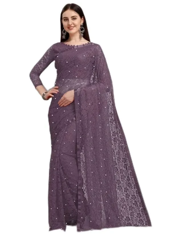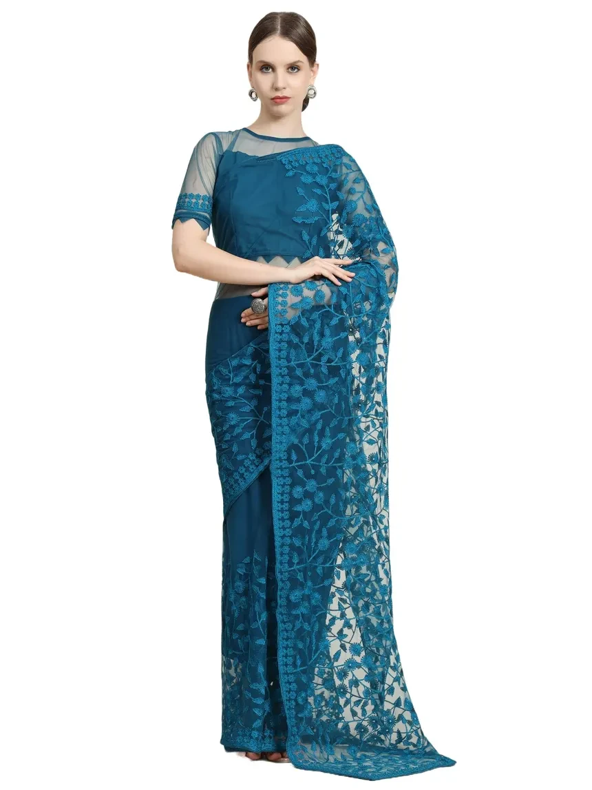 Elegant self-design Bollywood-style net saree for women, offering a graceful and stylish look for festive and special occasions.